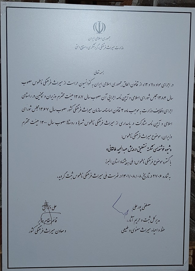 شیوه شکسته نستعلیق عبدالمجید طالقانی ثبت ملی شد